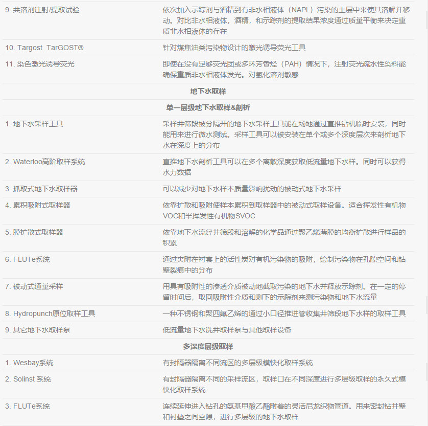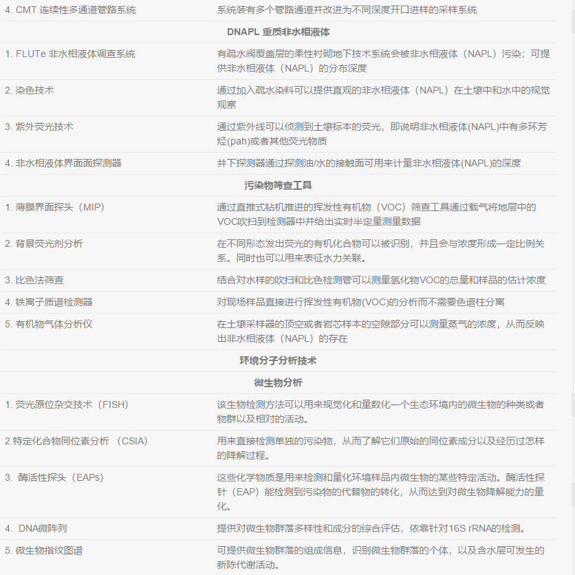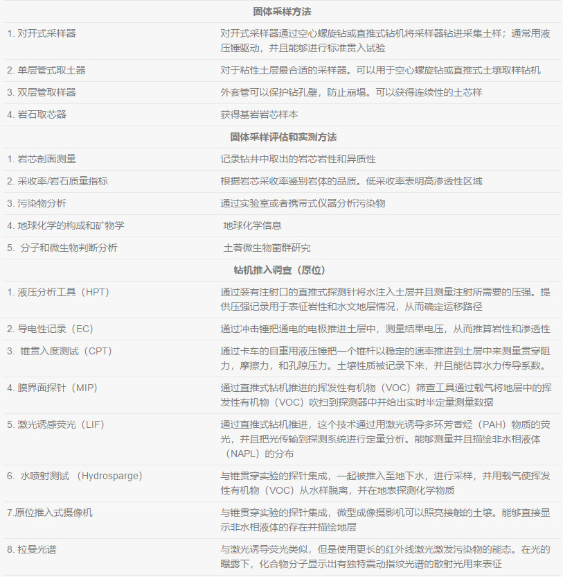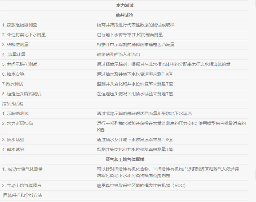 在不同種類的土層中, 都存在影響著DNAPL、溶解態(tài)還有氣態(tài)污染物行為的物理特性。地質(zhì)參數(shù)可以幫助了解土層中影響所有相態(tài)污染物(NAPL,溶解態(tài),吸附態(tài)和氣態(tài))遷移的宏觀和微觀特征。每一個地質(zhì)參數(shù)都在一定程度控制著土壤地下水的水文特征。通過分析比較土層中的物理特征與測量到的土壤地下水中流動相的水文特征,可以了解污染物的遷移和分布,并完善并驗證場地概念模型。地質(zhì)、水文和化學特性應該要同時評估并進行分析。